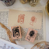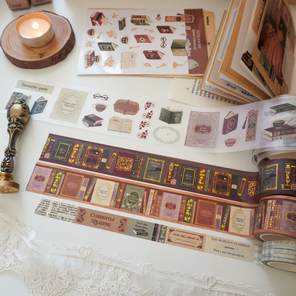- 1 x A6 Library Chronicles Washi Paper Sticker Sheet printing on premium Japanese washi sticker paper, each piece comes on a clear backing sheet for easy peeling.