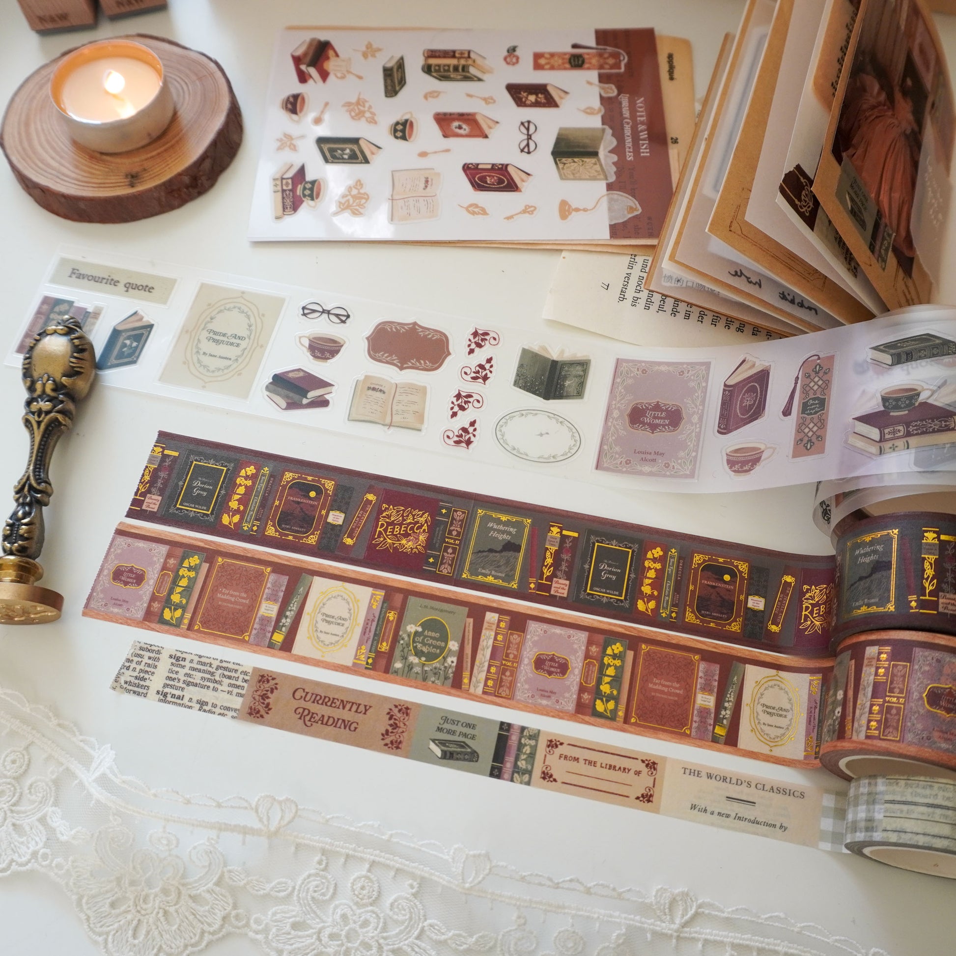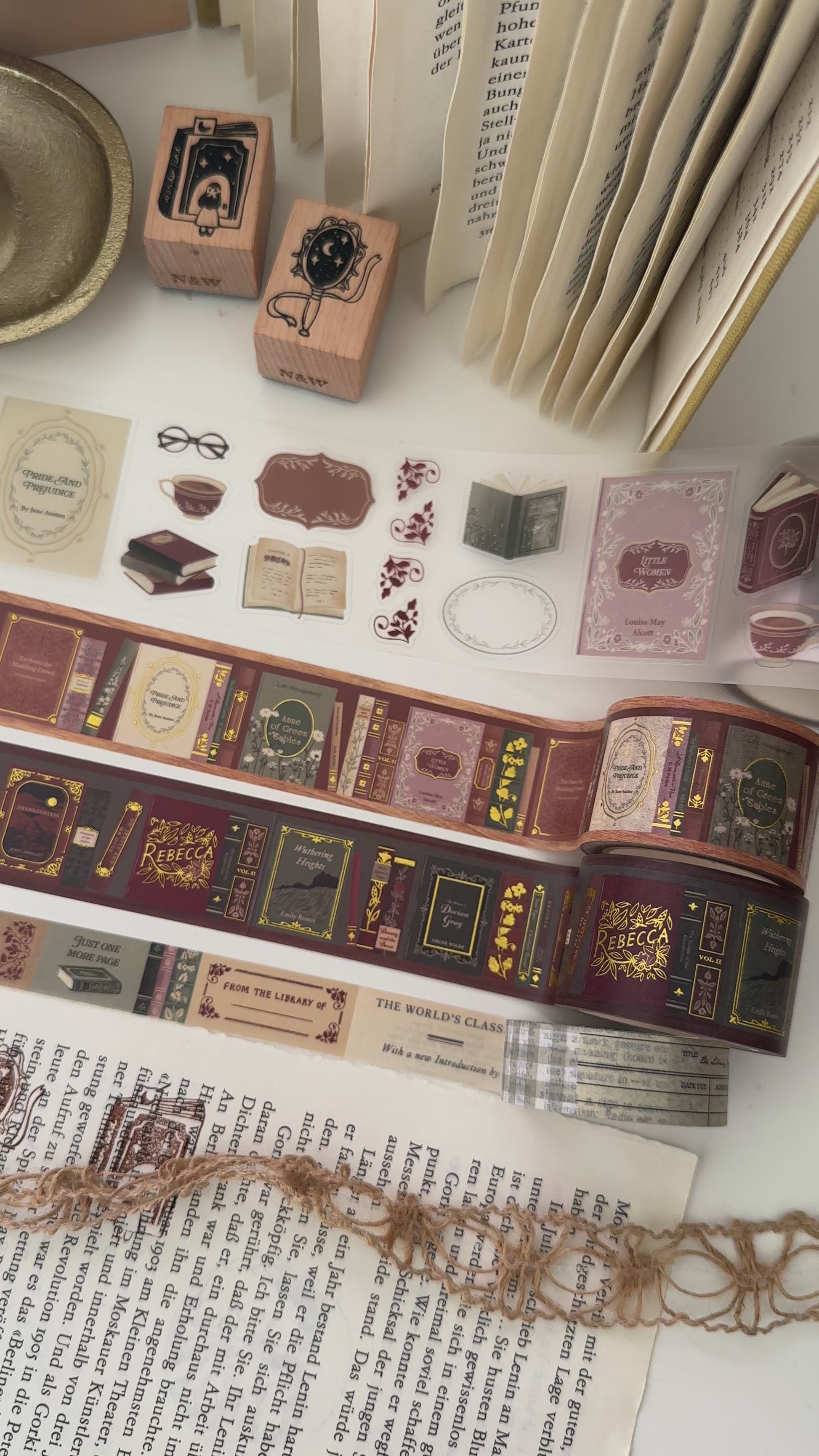 - 1 x A6 Library Chronicles Washi Paper Sticker Sheet printing on premium Japanese washi sticker paper, each piece comes on a clear backing sheet for easy peeling.