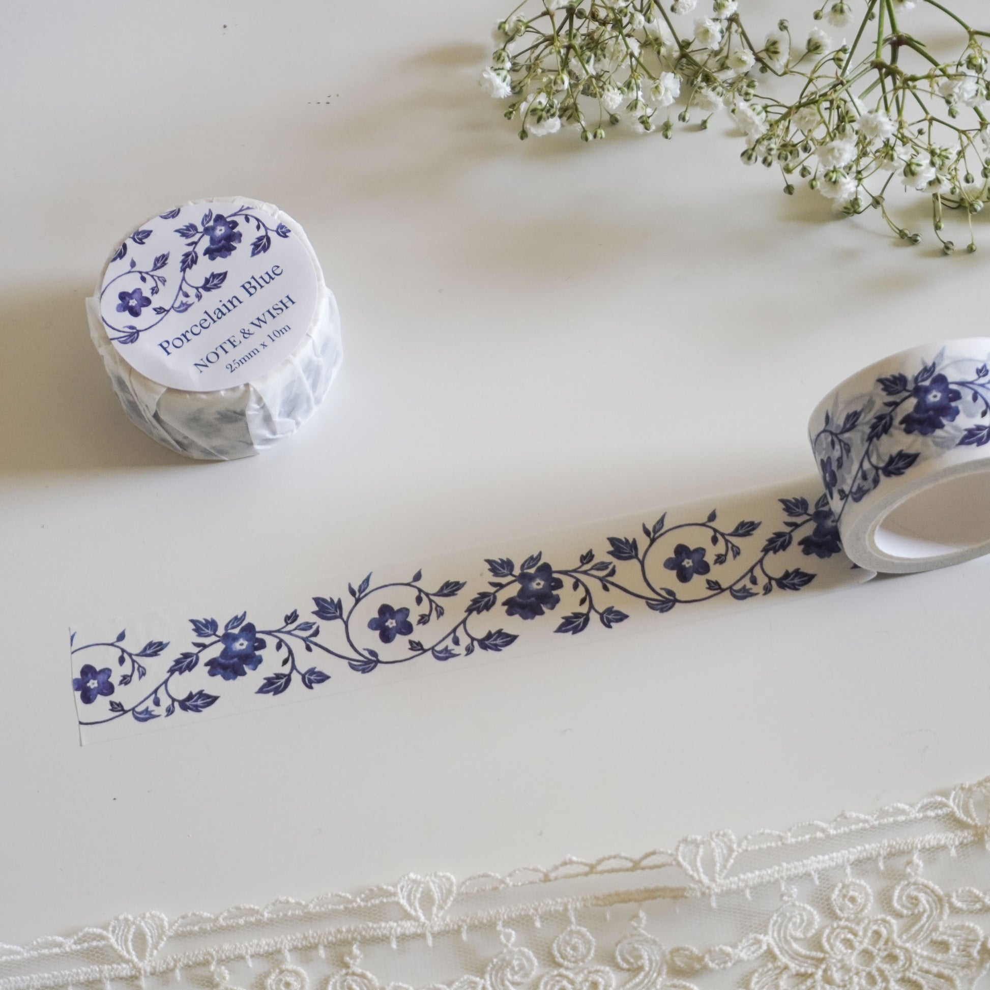 Inspired by Chinese porcelain, this iconic blue and white washi tape features beautiful hand-painted forget-me-nots.