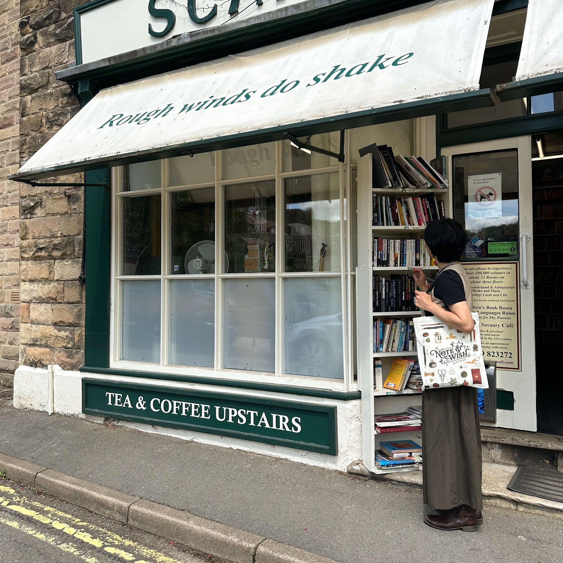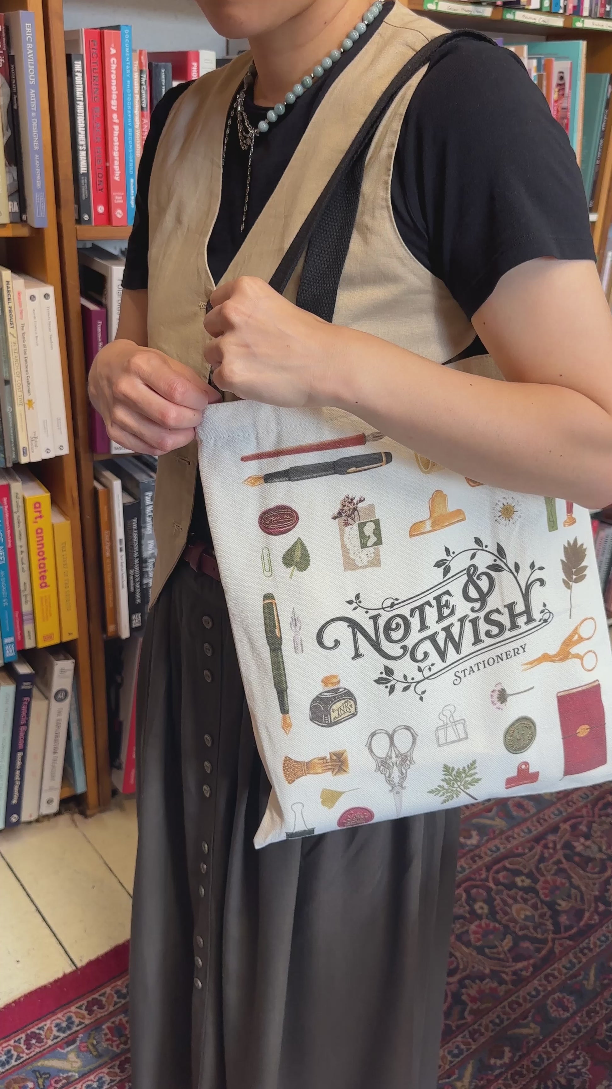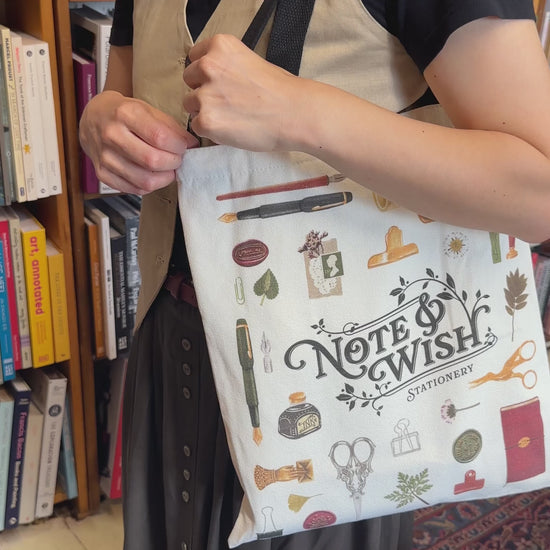 A beautiful stationery-themed canvas tote bag featuring original artwork by Rebecca of Note & Wish.