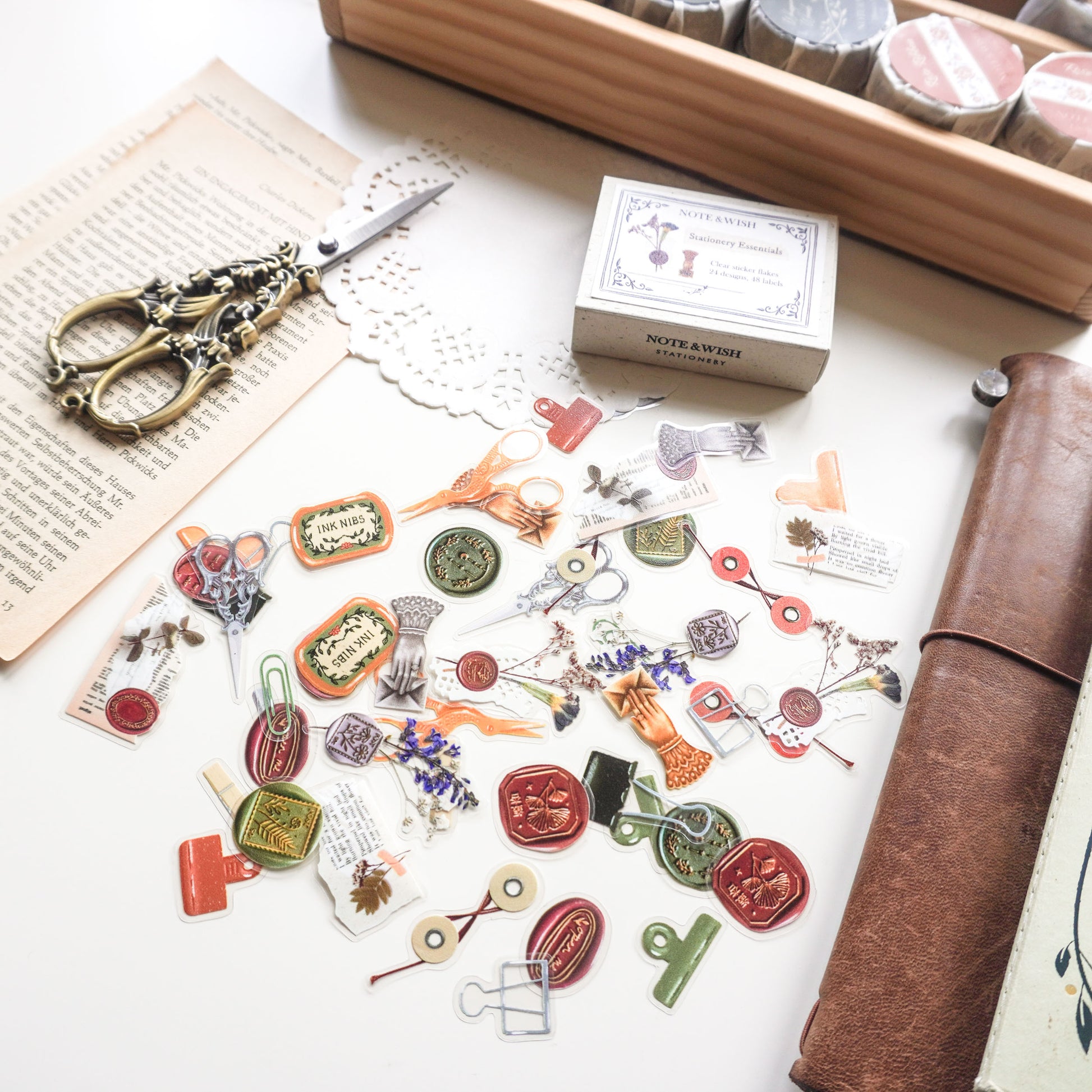 Stationery themed PVC stickers featuring original artwork by Rebecca of Note and Wish. Stickers are packaged in a matchstick box.